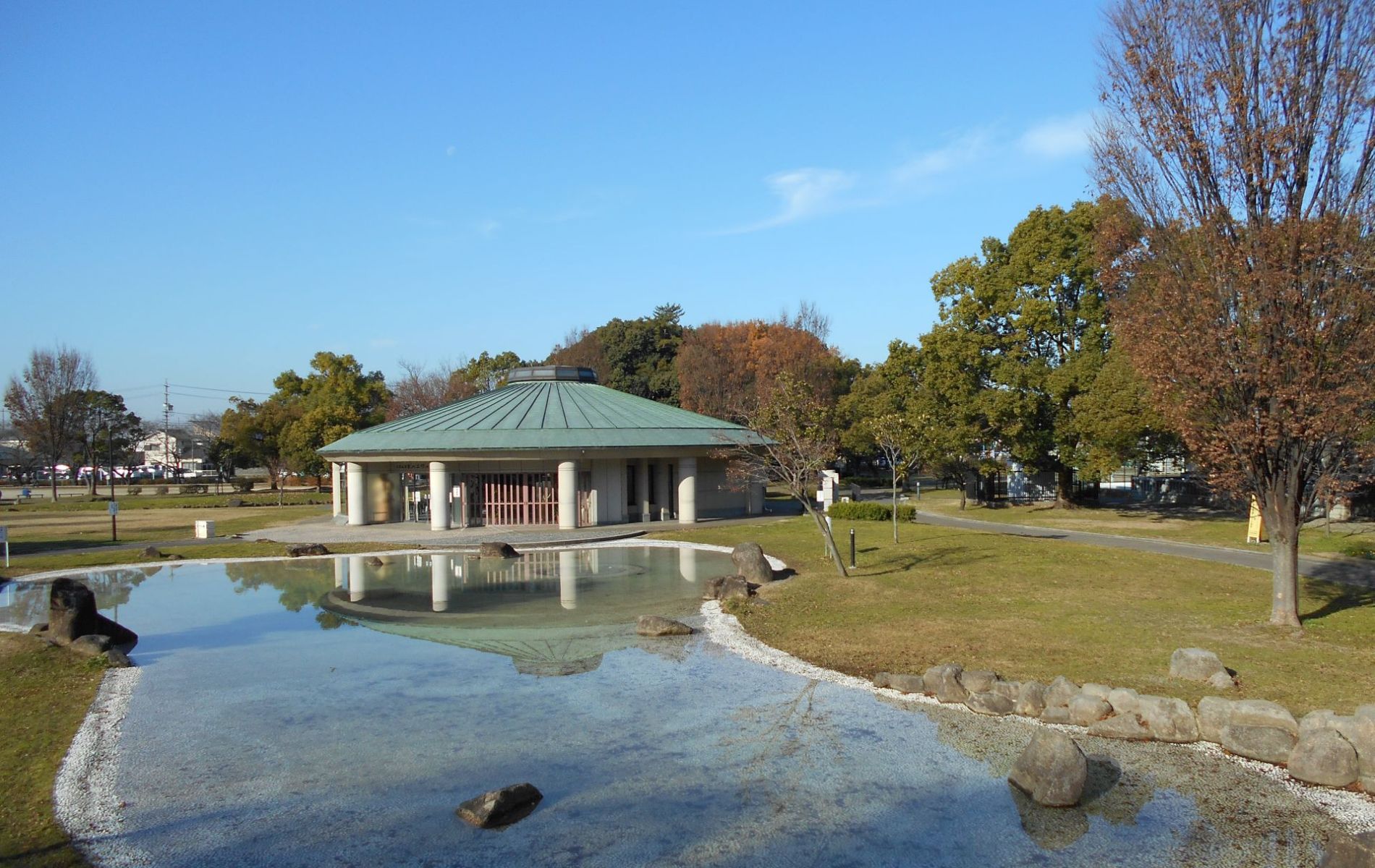 国指定の史跡である味美二子山古墳をはじめ、白山神社古墳、 御旅所古墳の3つの古墳に囲まれています。園内中央には円墳をイメージしたハニワの館が建てられ、 ガラス越しに古墳を望むことができる扇形の多目的ホールや埴輪の展示コーナーがあります。